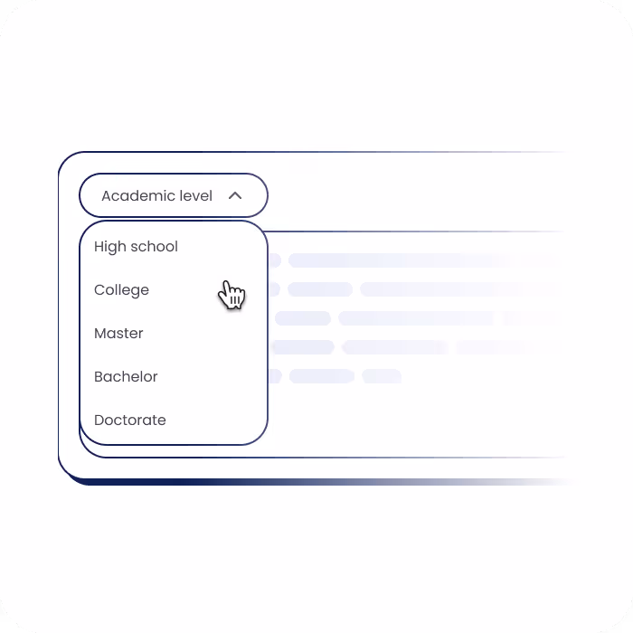 Our essay grader adjusts its results based on your educational level, ensuring the assignment meets specific requirements. You can pick the level in the dropdown menu before initiating the scan. The options range from High School to Doctorate.